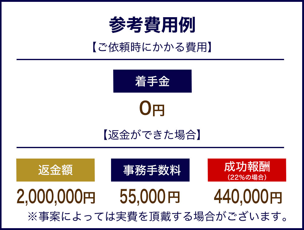 当事務所では、このような状況にある方々のご負担を少しでも軽減し、正当な返金請求をするために、着手金を無料でお受けすることにしました。